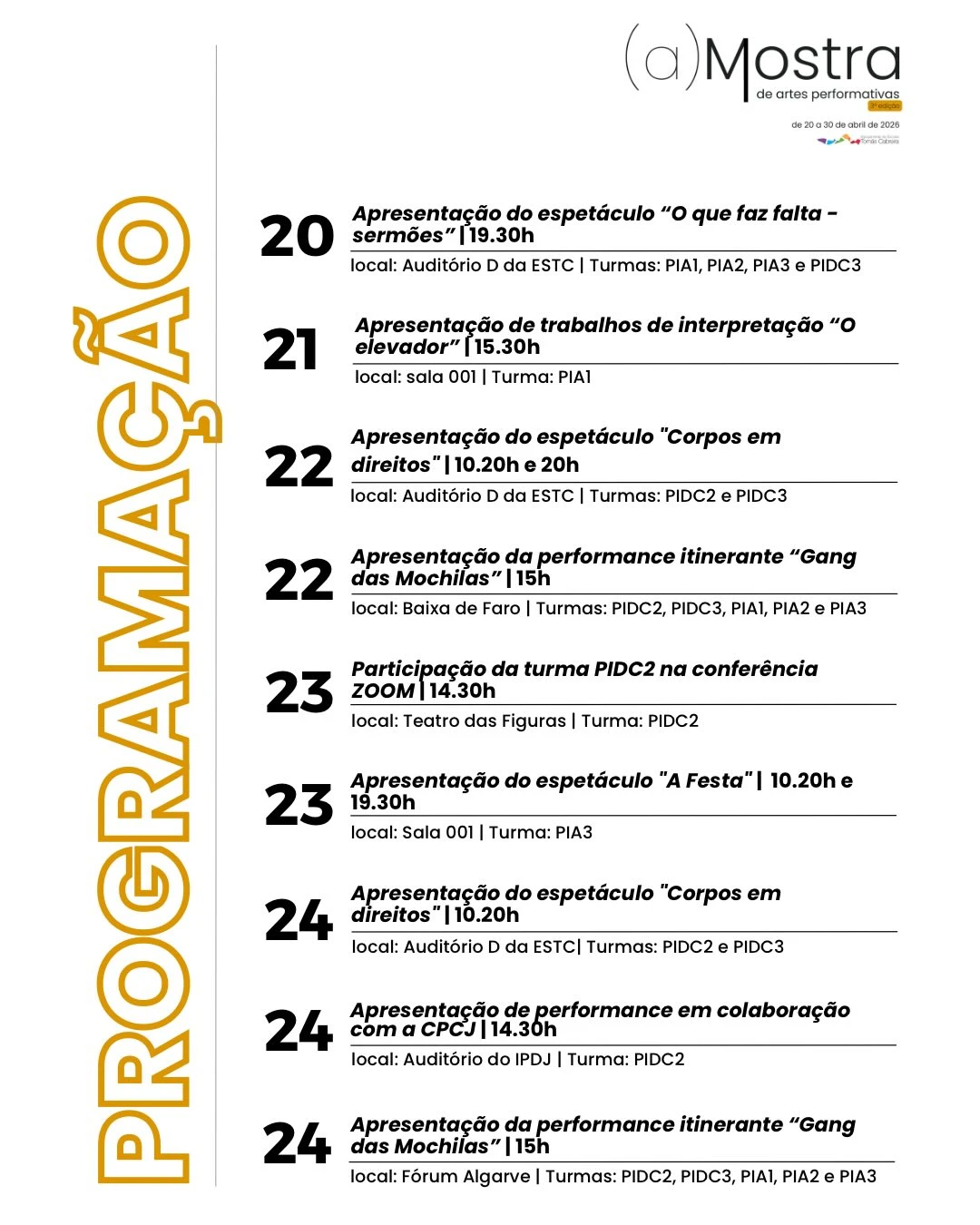 Ao longo de vários dias, serão apresentadas performances dos alunos dos Cursos Profissionais Intérprete de Dança Contemporânea e Intérprete Ator/Atriz, promovendo o encontro entre a comunidade e as artes. A agenda detalhada será divulgada em breve nas redes sociais.