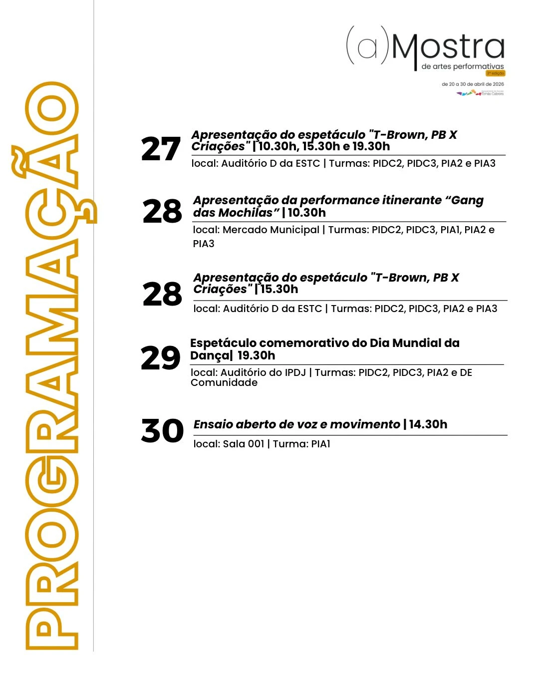 Ao longo de vários dias, serão apresentadas performances dos alunos dos Cursos Profissionais Intérprete de Dança Contemporânea e Intérprete Ator/Atriz, promovendo o encontro entre a comunidade e as artes. A agenda detalhada será divulgada em breve nas redes sociais.